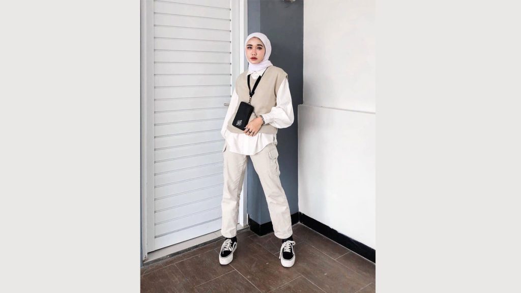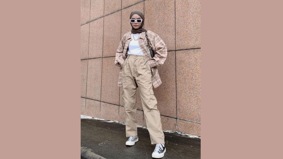 - یک استایل شهری و مینیمال میتواند شامل شلوار کارگو خاکی، تیشرت سفید ساده، کت جین آبی و یک جفت کفش اسپرت سفید همراه با یک شال سفید باشد.