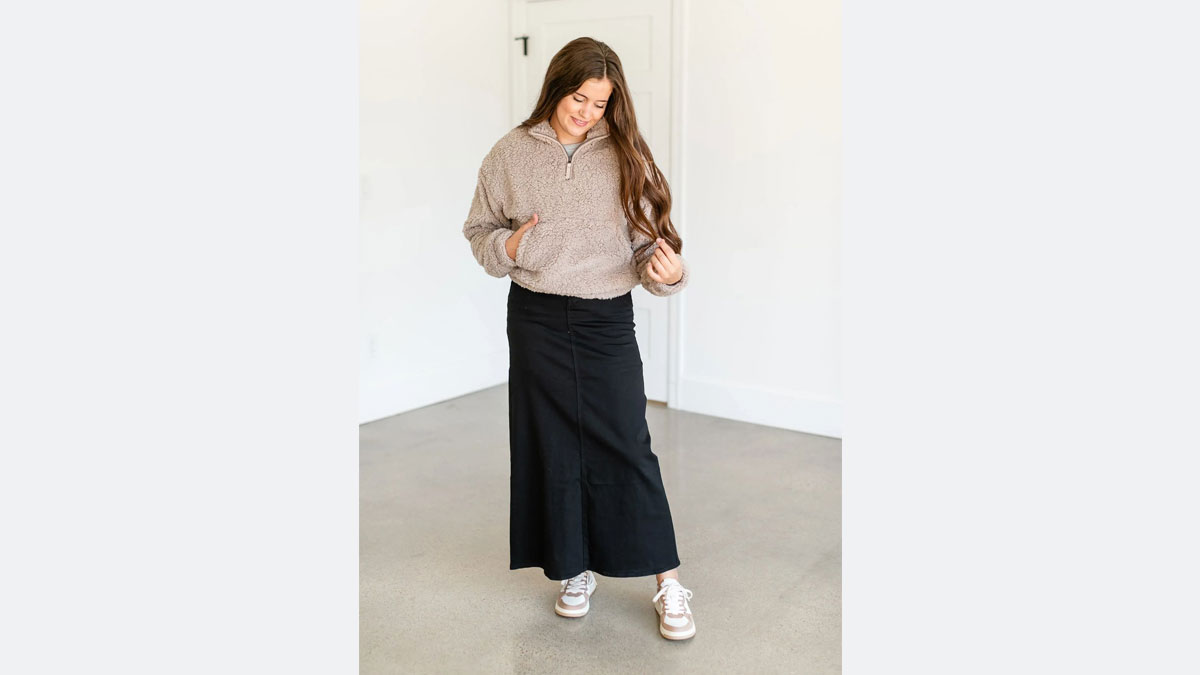- دامن جین: دامن زنانه جین ساده یا پلیسهدار، انتخابی جوانپسند و پرانرژی است. برای داشتن این استایل میتوانید دورس نیم زیپ خود را داخل دامن بگذارید تا فرم منظمتری ایجاد شود یا آن را آزاد روی دامن بیندازید برای استایلی رها و کژوالتر. این ترکیب برای دورهمیهای دوستانه یا گردشهای روزانه انتخابی ایدهآل است.
